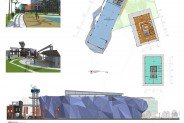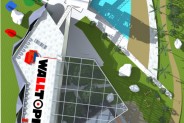 The concept for WALLPOPIA commences with a low concrete landscape rising from the ground encompassing multiple outdoor activities before metamorphosing into a ‘rock’ building wall that is the main climbing structure of the activity centre.